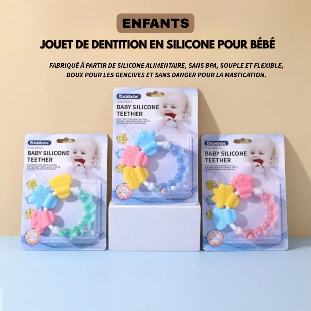Spécialement conçu pour les gencives sensibles, cet anneau de dentition bébé est fabriqué en silicone souple de qualité alimentaire. Sa texture douce masse les gencives sans les irriter, et aide à soulager naturellement les douleurs liées aux premières dents.