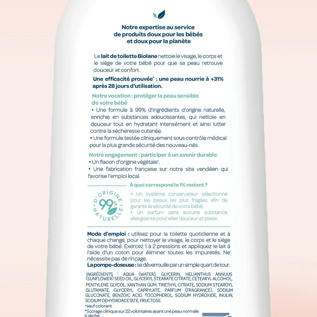 Le lait de toilette Biolane nettoie en douceur le visage, le corps et le siège de votre bébé, sans rinçage. Formulé à 99 % d’ingrédients d’origine naturelle, il est idéal pour la toilette quotidienne des bébés à la peau sensible. Léger, pratique et fabriqué en France, il offre une hygiène parfaite avec un maximum de douceur.