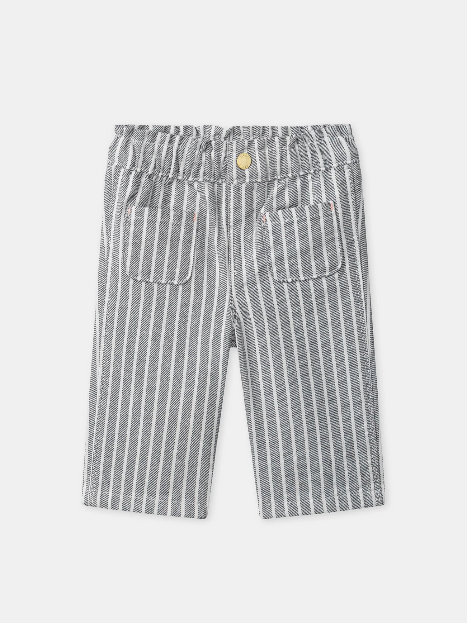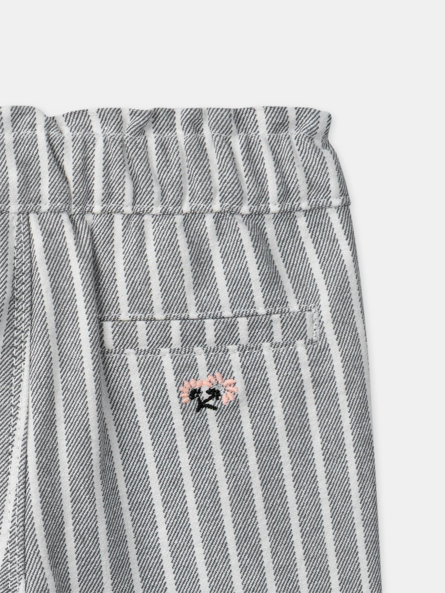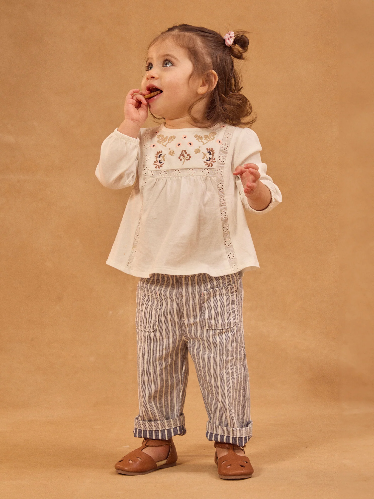 Pour les petites filles élégantes au quotidien. Son tissu rayé assure une belle tenue. Les broderies fleurs fluo ajoutent une touche moderne.