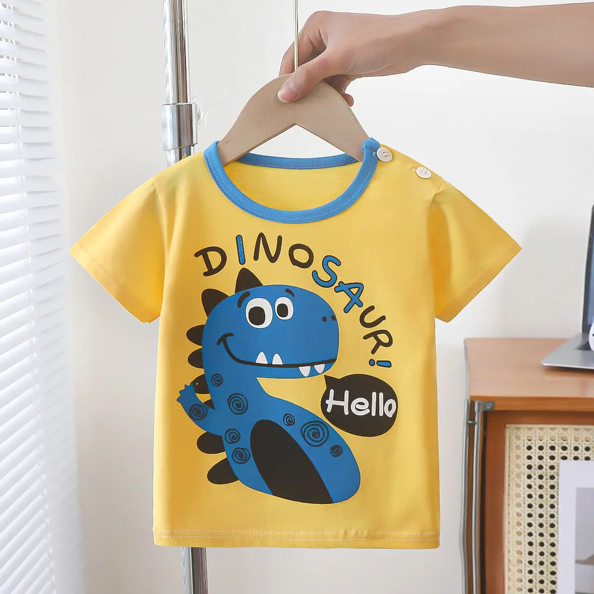 3. T-shirt jaune dinosaure bleu – “Hello Dinosaur!”