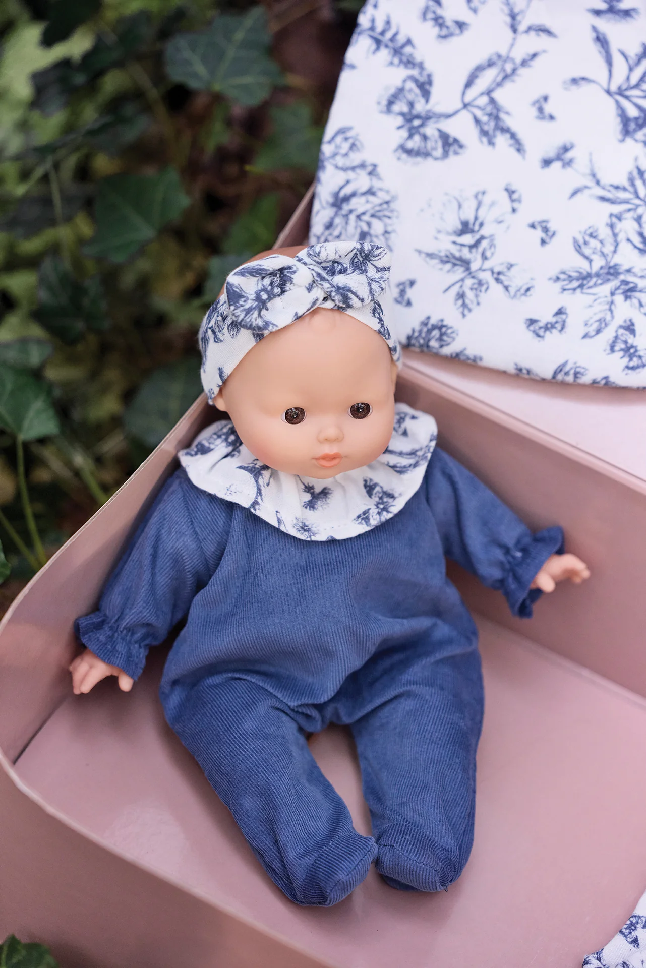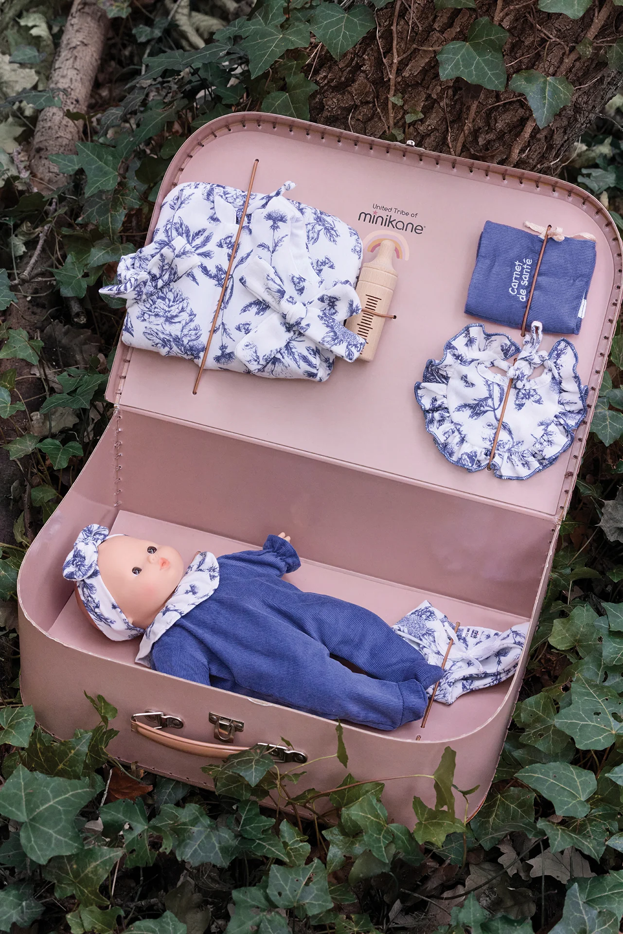 Tartine et Chocolat s’associe à la marque Minikane pour imaginer une collection inspirée de l’imprimé iconique Toile de Jouy. Découvrez la valise Clarisse avec les essentiels pour s’occuper de sa poupée, reprenant l’imprimé de notre ligne de linge de maison Toile de Jouy bleu : une poupée Minikane, un dors‑bien en velours avec un col volanté Toile de Jouy, un bavoir Toile de Jouy, une couche en tissu Toile de Jouy, un mini carnet de santé en velours, un biberon en bois, une gigoteuse Toile de Jouy et un bandeau Toile de jouy